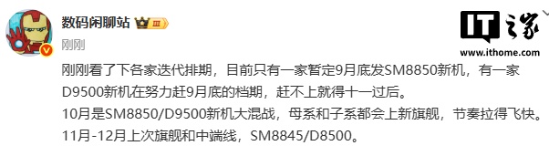 消息称只有一家厂商暂定 9 月底发布第二代骁龙 8 至尊版新机,10 月进入混战